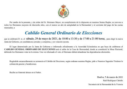CABILDO GENERAL DE ELECCIONES será el salón de