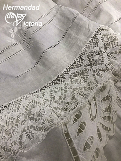 realizada con técnica de bordado Richelieu, bolillos